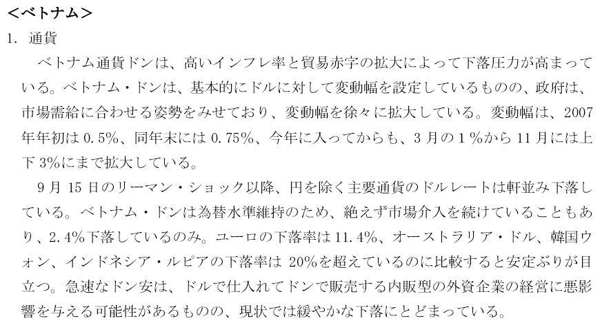 ジェトロの記事では、ベトナムは世界的な景気後退の影響を比較的受けていないようである。考えられることは、ベトナムも貧富の差が大きくなり購買力にも大きな差が生まれていること、チューリップバブルに類似の盆栽バブルが起こっている可能性が大きいこと(新聞記事にも転売が繰り返されとある)であると思われる。