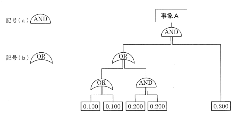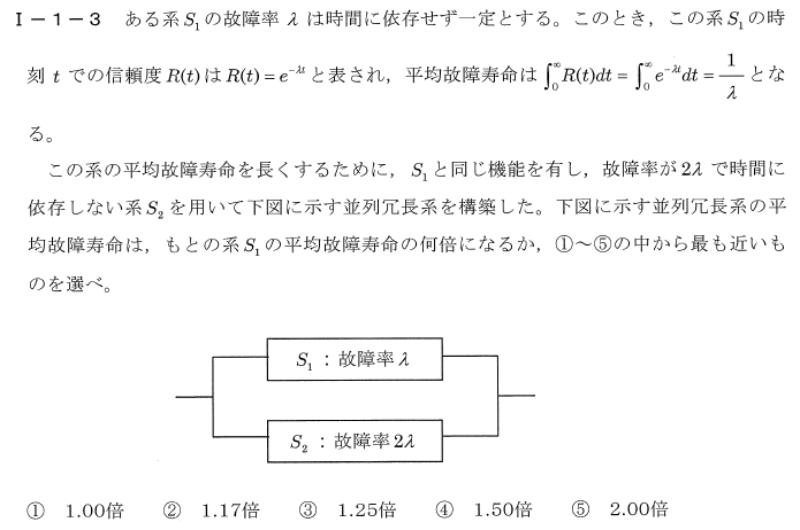 | A01  信頼度 努力目標 直列、並列を理解すれば解が見えるようになる 技術士試験の問題からは必要最小限の引用にとどめる。(問題)が記されている部分はその引用である。 問題および解答は日本技術士会のホームページより必要に応じて入手してください。 技術士第一次試験の問題 問題番号が赤字のものは、ボーナス問題 過去に同じ問題が多く出題されている。 H28年 T−1−1 H27年 T−1−1 H26年 T−1−4 H24年 T−1−1 H23年 T−1−1 H22年 1−1−3 H19年 T−1−1 H18年 T−1−1 H17年 T−1−1 H17年 T−1−6 H16年 T−1−3 基本的に同じ問題 H28年 T−1−1 H27年 T−1−1 H26年 T−1−4 H24年 T−1−1 H23年 T−1−1 H19年 T−1−1 H18年 T−1−1 H16年 T−1−3 分類1 回路の信頼度を求める問題 故障率は 1−x 並列の場合は2つの回路が同時に故障すると初めて故障となるから、並列回路の故障率は(1−x)2 従って、並列回路の信頼度は(1-故障率)=(1−(1−x)2)となる。  分類2 FTA(Fault Tree Analysis)図 問題 H17年 T−1−1より  分類3 数式で表される確率 問題 H22年 T−1−3より  H28年 T−1−1 H28年度問題 正答: C (解答) 問題を数式化すると、 0.90×(1−(1−x)2)×0.90 = x×0.95×x この式より、x=0.92 この値を上式に代入すると、左辺、右辺共に0.804となる。 H18年 T−1−1 H18年度問題 正答: B (解答) 回路が正常に動くのは、1.回路が3つ共に正常に動く場合、2.1つの回路は故障するが残りの回路2つが正常に稼働する場合、の2通りの合計で、2.は構成要素A、B、CのAだけが故障、Bだけが故障、そしてCだけが故障する3つの場合がある。 従って、回路が正常に動く信頼度は、0.83+3×0.82×(1−0.8)=0.896 となる。 論理回路である。理屈は上に示した分類1と同じである。 H17年 T−1−1 H17年度問題 正答: A (解答) ANDは直列に相当、ORは並列に相当。これさえ押さえておけばこの問題は簡単に解ける。 下左側から順番に計算していく。 0.100 OR 0.100 = 1−(1−0.100)2 = 0.19 部分A 0.200 AND 0.200 = 0.200×0.200 = 0.040 部分B 部分A OR 部分B = 1−(1−0.19)×(1−0.04) = 0.2224 部分C 部分C AND 0.200 = 0.2224×0.200 = 0.044 事象A 分類3 数式であらわされる故障率 H17年 T−1−6 H17年度問題 正答: B (解答) 100単位のシステムが単位時間内に故障しない確率は、言い換えれば100単位のシステムを直列につないだときに、単位時間内に故障しない確率である。従って 0.99100≒0.9520≒0.774≒0.35 計算間違いをしないように気を付けさえすれば、答えが得られる。 H22年 T−1−3 H22年度問題 正答: A 下の問題は、今まで示してきた問題とは毛色の違う問題である。上で示した分類2である。 理解したうえで、答えを見ないで自分で解いてみる。そして、何日か後にもう一度解けるかを確認してみる。 (解答) 並列であるので、 信頼度R(t)=1-(1-exp(-λt))×(1-exp(-2λt))=exp(-λt)+exp(-2λt)-exp(-3λt) 平均故障寿命は、 平均故障寿命=∫R(t)dt=∫exp(-λt)dt+∫exp(-2λt)dt-∫exp(-3λt)dt 積分範囲は0から∞まで。 ∫exp(-ax)dx=[exp(-ax)/(-a)](x = 0 to ∞) = 1/a 従って、積分式は、 =1/+1/(2λ)-1/(3λ)=7/(6λ) S2を並列に加えない前の平均寿命が1/λであるから、並列とすることにより寿命は7/6倍、1.17倍となった。 問題一覧表へ戻る |