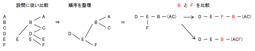 | A18 論理判断 努力目標 絵を描いて考える 技術士試験の問題からは必要最小限の引用にとどめる。(問題)が記されている部分はその引用である。 問題および解答は日本技術士会のホームページより必要に応じて入手してください。 技術士第一次試験の問題 問題番号が赤字のものは、ボーナス問題 H17年 T−1−5 正答: C 絵を描いて考えてみる。 (解答) 設問に従って大小関係を比較する。そして、その順序を整理しなおす。それを見やすいようにしたものが「=」の右側の図である。 (AC)はAとCの大小関係が決定していないことを意味している。 設問は上に示す@〜Dのなかで、正しいものはどれかを求めている。 @ DとEの位置づけは1番と2番と決定しているから誤り。 A DとEの位置づけがはっきりしているので誤り。 B〜Dは同じ内容についてそれぞれ異なったことを言っている。従って、少なくともこの中の2つは誤りである。 「=」の右側の図でBとFを比較する。1回目の比較である。 上のケースでは「D−E−F−B−(AC)」と4つの並び順が決まり、あとはAとCの比較ですべての並び順が決まる。 下のケースでは、AとCとFの並び順を決定する必要があるので、あと1回の比較ではその順番は決まらない。 従って、BとFの比較、次いでAとCの比較をすると、確率50%で並び順(順位付け)が決定できる。 設問の「うまく組み合わせを選べば」という言葉は意味深長である。 ![]() 問題一覧表へ戻る |