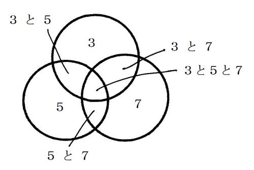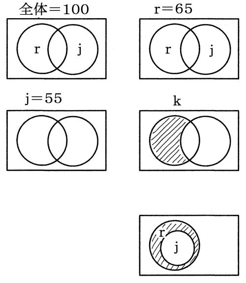 | B09 集合に含まれる数 努力目標 理解する 技術士試験の問題からは必要最小限の引用にとどめる。(問題)が記されている部分はその引用である。 問題および解答は日本技術士会のホームページより必要に応じて入手してください。 技術士第一次試験の問題 問題番号が赤字のものは、ボーナス問題 H25年 1−2−4 H22 T−2−3 H18年 1−2−2 同じ問題 H22 T−2−3 と H18年 T−2−2 H25年 T−2−4 正答: C (解答) 図に書いて理解するというのが、こういう問題の常道でしょう。ということで図に書いてみました。 ![]() まずわかることは、rとjの件数を足し合わせても100を超えることはないということです。 k + j ≦ 100 と言うことですね。k + j は 面積では r + j、記号に直せば r U j です。 従って、求める k の範囲は k ≦ 100 − j =100 − 55 =45 そして次が気が付きにくいのですが、 r の領域に j がすっぽり収まった時にも k が存在します。 この時の k の値は、 r − j = 65 − 55 = 10 従って、 10 ≦ k ≦ 45 となります。 上の 45 が得られた段階で5択は2択まで絞られますが、 10 は気づきにくいと思います。 こんな問題が出題されたら、自信がない限り近づかないことですが、1時間の間にこの手の問題を15問解かなければならない技術士第一次試験において、そんな選択をしている余裕もないでしょう。 この問題を選んで思考の迷宮に陥ってしまうと時間のロスとなります。 H22年 T−2−3 正答: B (解答) ![]() 3、5、7の倍数を求める。 [3の倍数]+[5の倍数]+[7の倍数]−[3と5の倍数]−[5と7の倍数]−[7と3の倍数]+[3と5と7の倍数] =300+180−60−26−43+9=488 最後の項で[3と5と7の倍数]を加えたのは、中心部分を引きすぎたため。[3]+[5]+[7]で3重に、そこから−[3、5]−[5,7]−[7,3]で0重に、そこで[3,5,7]を加えて1重とした。 100から999までの900個の数字のなかで素数3か5か7のすくなくともいずれか倍数であるものは488個と求まった。そうすると、3か5か7の倍数でないものは、900−488=412個となる。 問題一覧表へ戻る |